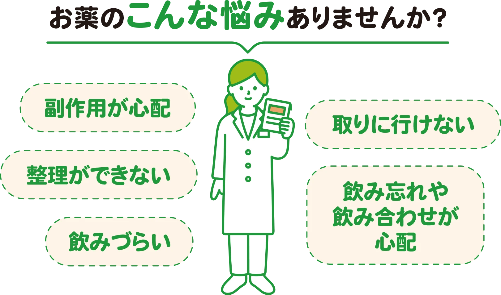 - 処方箋に基づいてお薬を調剤し、ご自宅や施設までお届けいたします。外出が難しい方やお忙しい方でも、安心してお薬を受け取っていただけます。ご希望に応じて服薬の確認や相談もその場で行います。